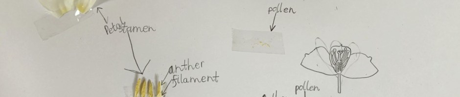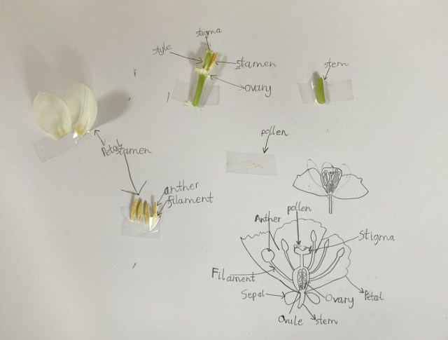 Then I asked if they could try and label the different parts. So we got some card and tape out and then they set about creating their own “scientific flower pages”.