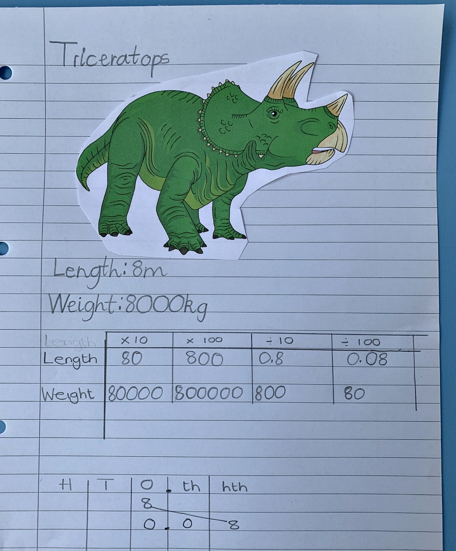So when we started looking at decimals and dividing by 10 and 100 to get decimals I immediately thought we could do some dinosaur maths.