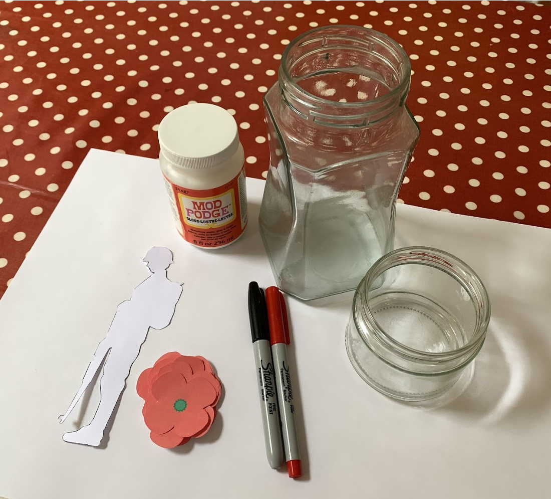 We had our soldier templates that we used in our soldier template pictures and I also downloaded the poppy printable sheet from Activity Village. As always the glass jars that we use for our luminaries are recycled glass jars that we have just cleaned and our very handy Mod Podge (really handy for all kinds of crafts).