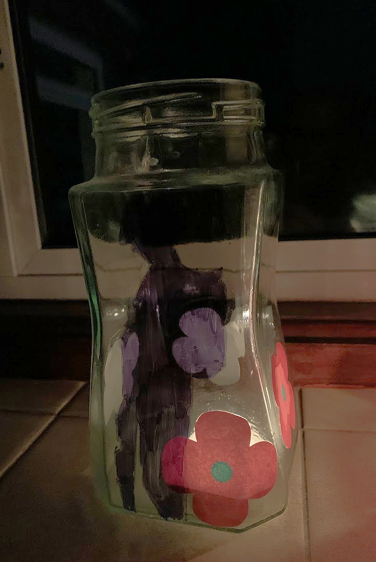 And then with the poppies we just cut them out and glued them onto the glass jars with our Mod Podge. When you apply the Modge Podge it does leave white streaks but they dry completely transparent so don’t be afraid to apply the Mod Podge over the images.
