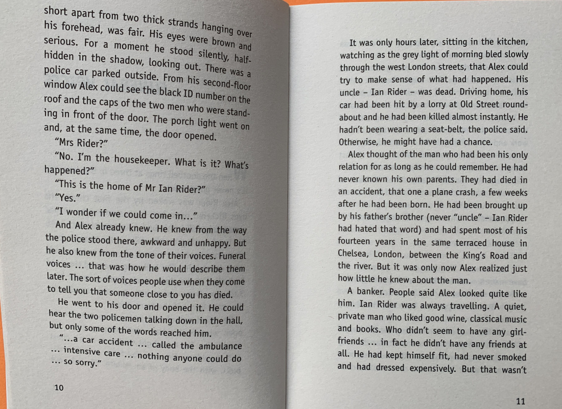 Also I do think it is a good idea to read the books in order. There are events and characters that are carried through from the earlier books so it does make a bit more sense to try and stick to the order. If you stick to the order you also get to really see the character of Alex Rider develop and grow.