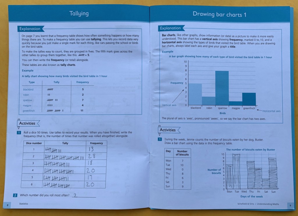 We have used this series a lot with both my kids. The pages always have a concise explanation and then a couple of activities below it. And like I mentioned above they always seem to build up the topic in a way that makes sense i.e. talking about tally marks before bar charts and talking about bar charts before pie charts. It’s just an order that I personally like and it would be the order that I would do it even without the workbook.