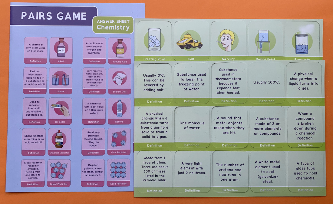 Our Chemistry Matching Pairs game arrived this week and we have already been using it and I love it. For only £4.99 what you get is excellent value for money. There is no way I could reprint all these images (75 cards with images and another 75 cards with the matching definitions) for this price, plus the time to try and find matching images and create cards like this, yip very good value for money.