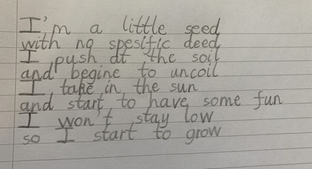 I thought the lessons highlighted some important aspects of writing poetry and then without dragging on too long in lesson 5 the kids start trying to write their own poem. My youngest actually just joined us for part of the 4th and 5th lesson and then had a go at creating his own poem (this is his first draft).