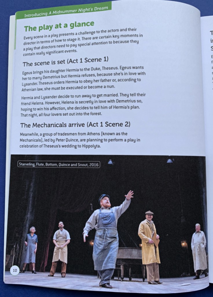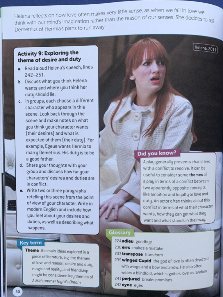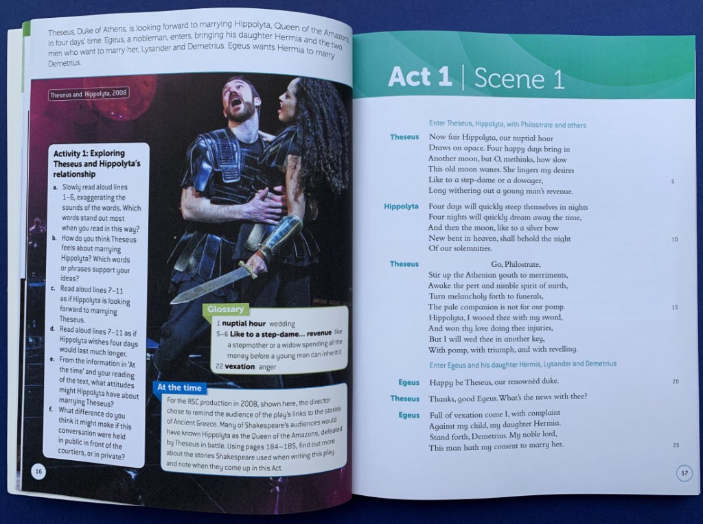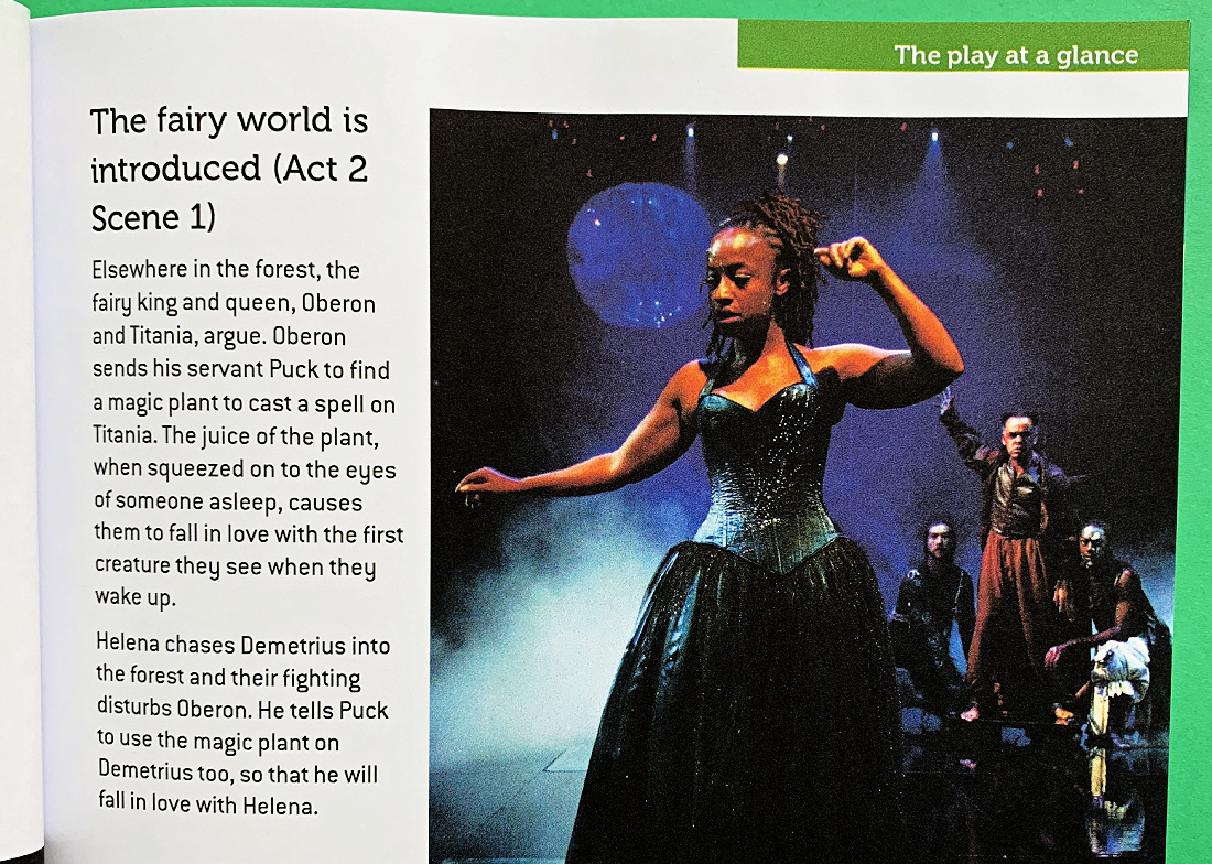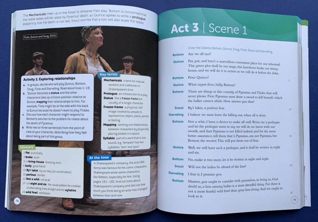 The play itself is set out over double pages. On the Right is the actual text and then on the Left is what my daughter calls the “explanation page”. There is always a picture of the scene being acted out which for us is key. Just looking at the photo helps to explain what is happening in the text and it brings it to life. These photos are vital for visual learners like my daughter. At the top of the picture there is a one or two line summary (we love this), there are glossary and key term blocks which explain unusual words and then there is always a suggested activity. Now the activities are written with a school setting in mind so often they involve things like act out, discuss in a group etc etc but my daughter says she just thinks about the activity in her head and if she thinks she can do it successfully she feels like she understands that page.