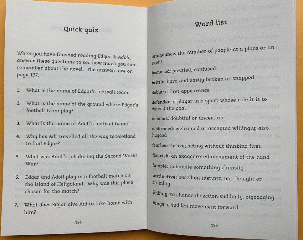 Edgar and Adolf is 121 pages. It is an easy, enjoyable read. And after the story they include some nice extra bits of information about the authors and the background to the the story. They also include a quick quiz and a word list of words which some readers may have struggled with.