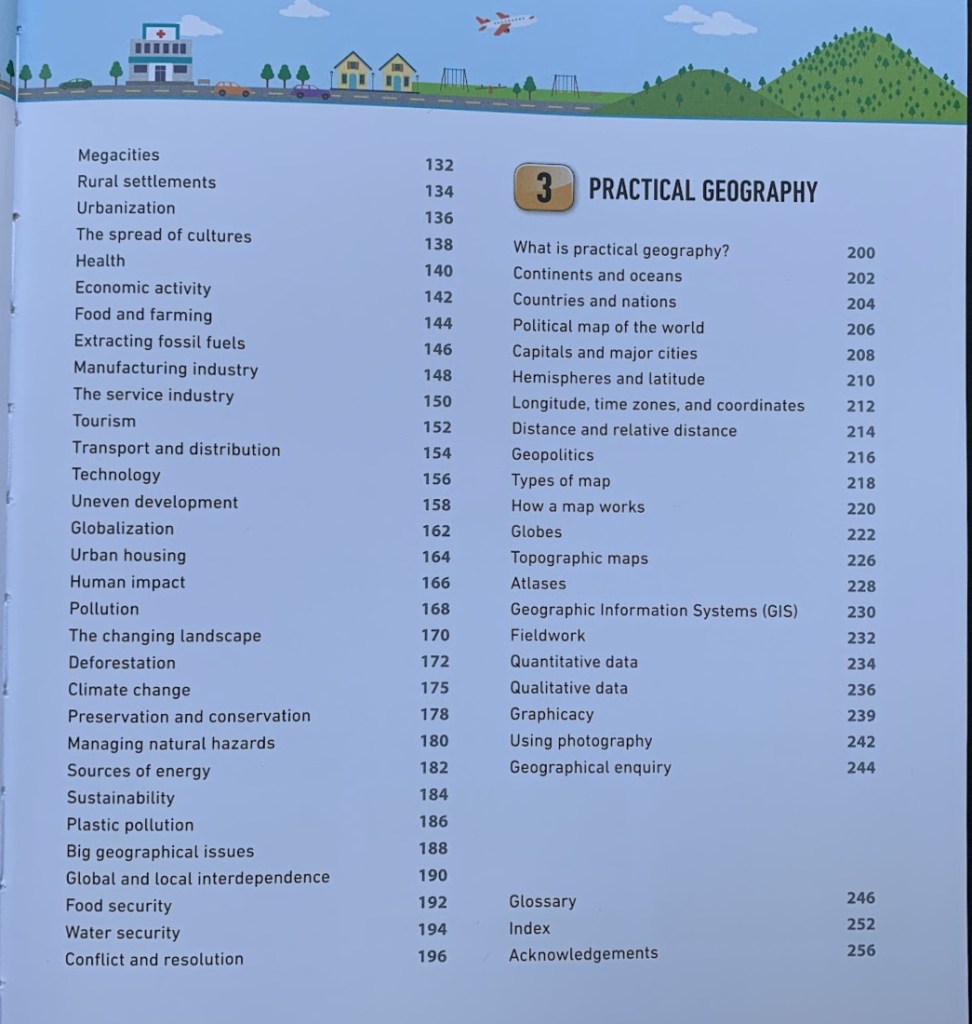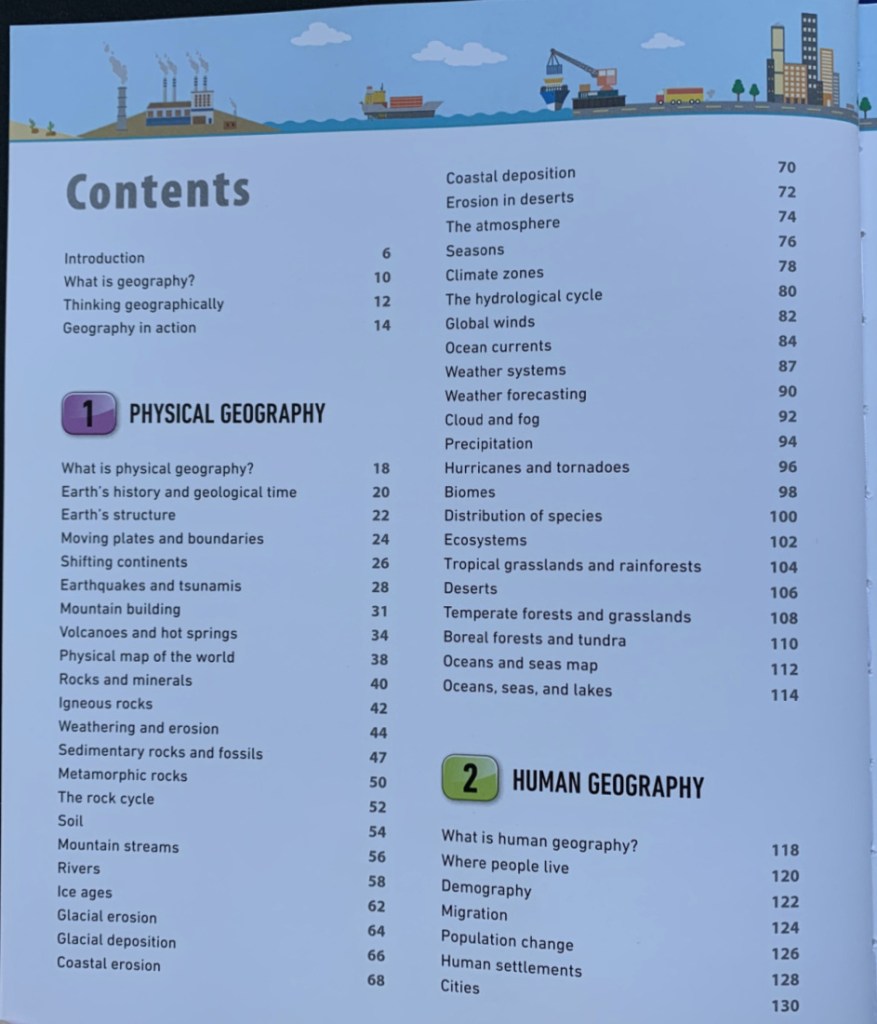 They have broken the book down into 3 sections – Physical Geography, Human Geography and Practical Geography. And in terms of what they cover under each section it is A LOT – too much for me to try and list out so instead I am going to include two photographs of the contents to show you.