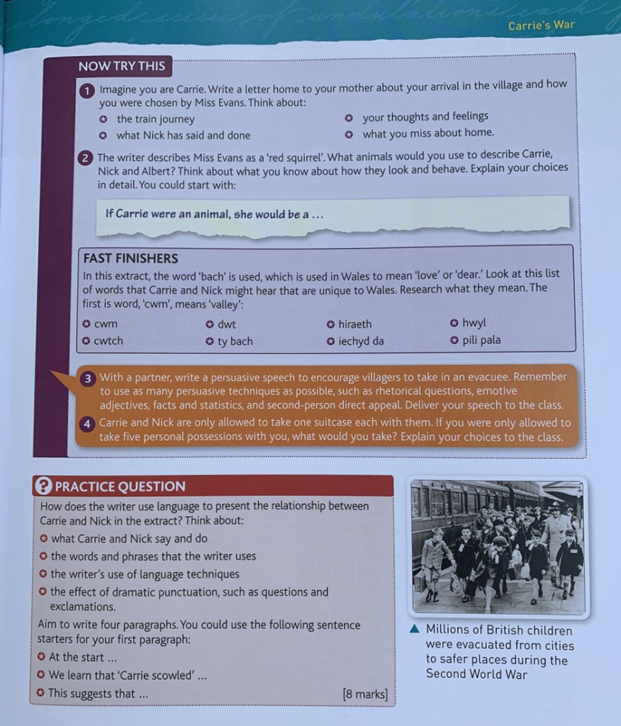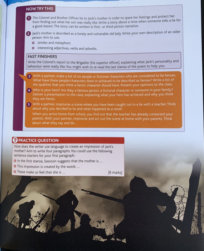 So what is this book – The War book is part of a 9 book series of English Anthology books published by Hodder Education (aimed at KS3 ages). Each anthology book covers a genre or theme – so far we have two of these books – the Myths and Legends Anthology book and this one, the War Anthology book. The books are split into 3 categories – Fiction, Non-Fiction and Poetry. For each of these three categories there are eight examples of War writing (so it could be an extract from a story, it could be a film review of a article and it could be a poem). For each war extract you get get activities linked to the writing. These activities are broken down into different type of tasks and range from questions about the piece of writing to creative writing activities, to possible speaking activities to further research and investigation activities. The activities are vast in their nature.