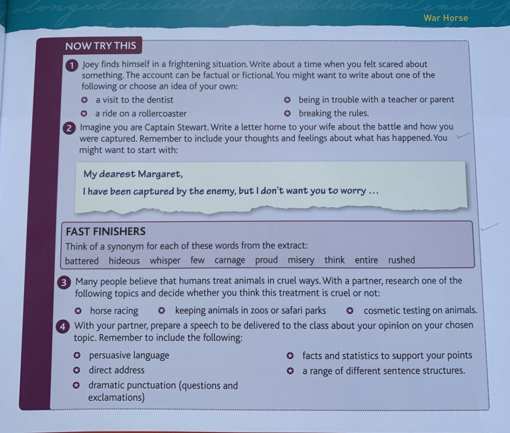 So what do we think of the actual writing samples (extracts) they have included? I personally think they have chosen well – they are all excellent examples of writing, both in the style that they are written and in the way they convey information and feelings about the war topic. One of the things that I like about these books is they actually inspire us to read (or watch) what they have chosen. After seeing the 1917 movie review in the book we actually watched the film and everyone really enjoyed it and thought it was thought provoking. And I must say that working through the activities on the movie helped to highlight a possible area that we could improve on. Also after completing the War Horse activities my daughter wanted to read the complete story (so possible negative point could be that you end up wanting to buy a number of new books based on the extracts included).