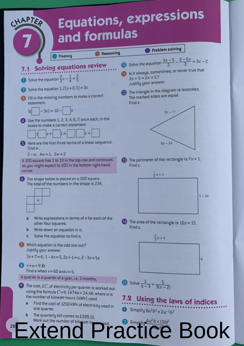 We started Year 9 with the Develop and Secure Practice Book 3 and we started by working through the first 3 chapters – Powers and Indices, Fractions and Accuracy. My daughter would go through the explanations in the text book, then do the band 1 and 2 questions in the text book, she would then flip to the questions in the practice book and then go back and do the band 3 questions in the text book. Which is a LOT of questions, but we have a “Maths needs to be practiced” approach. With these first 3 chapters I felt like she needed more challenging questions. She was cruising through the practice book and I want her to have some Maths questions that make her think, that she actually gets wrong the first time and we need to work through them. So we opted to buy the Extend Practice Book (it does only cost £6.99 and you get 73 pages of Maths questions and all answers are free to download from the site – which for me is a reasonable price.)