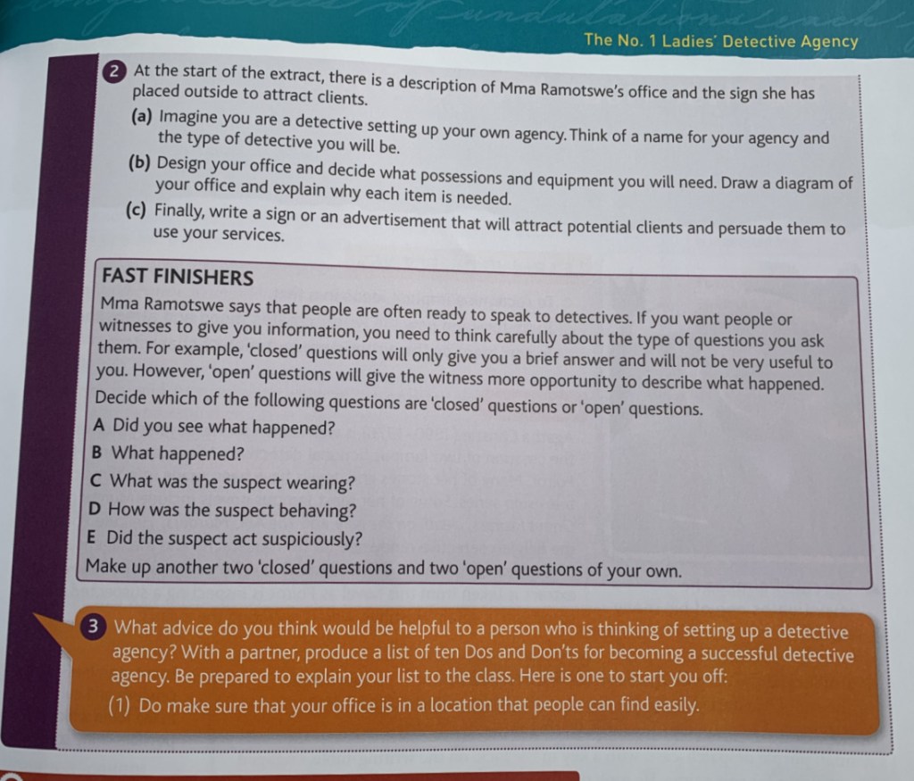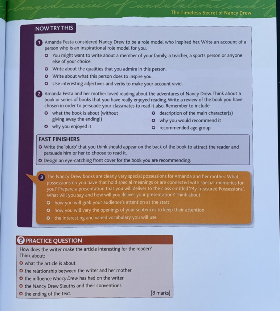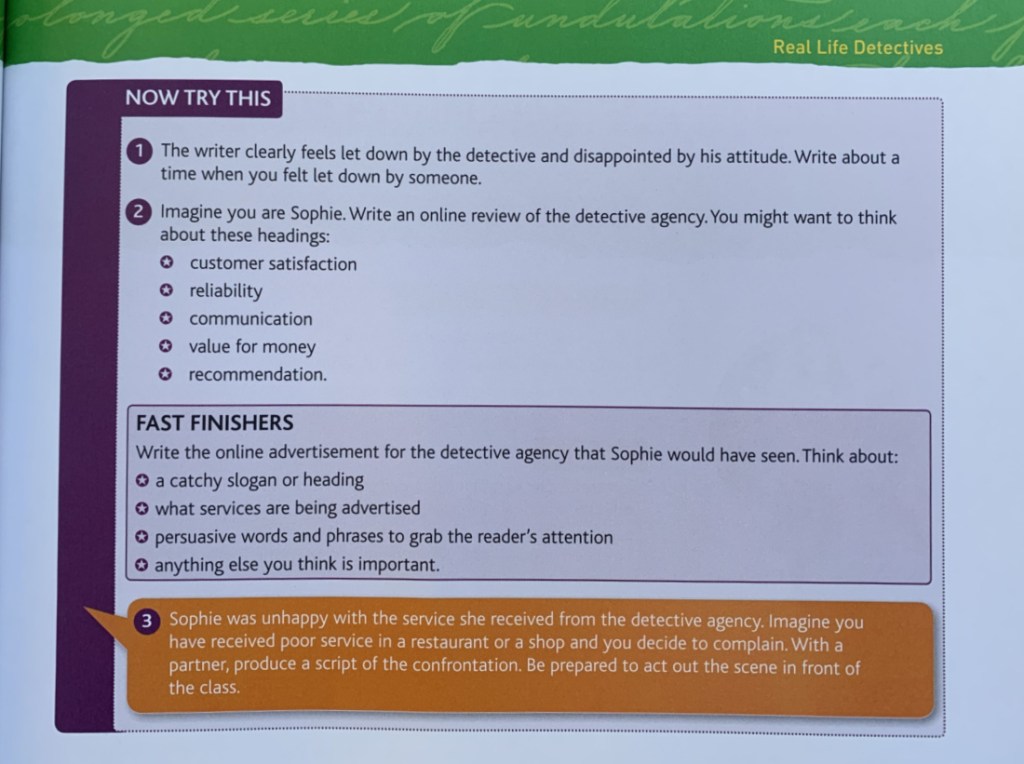 Now Try This – these are the longer questions. They include lots of different writing activities – create an advert, write a letter, write a newspaper article, diary entry all kinds of writing activities. I really like these longer writing activities.