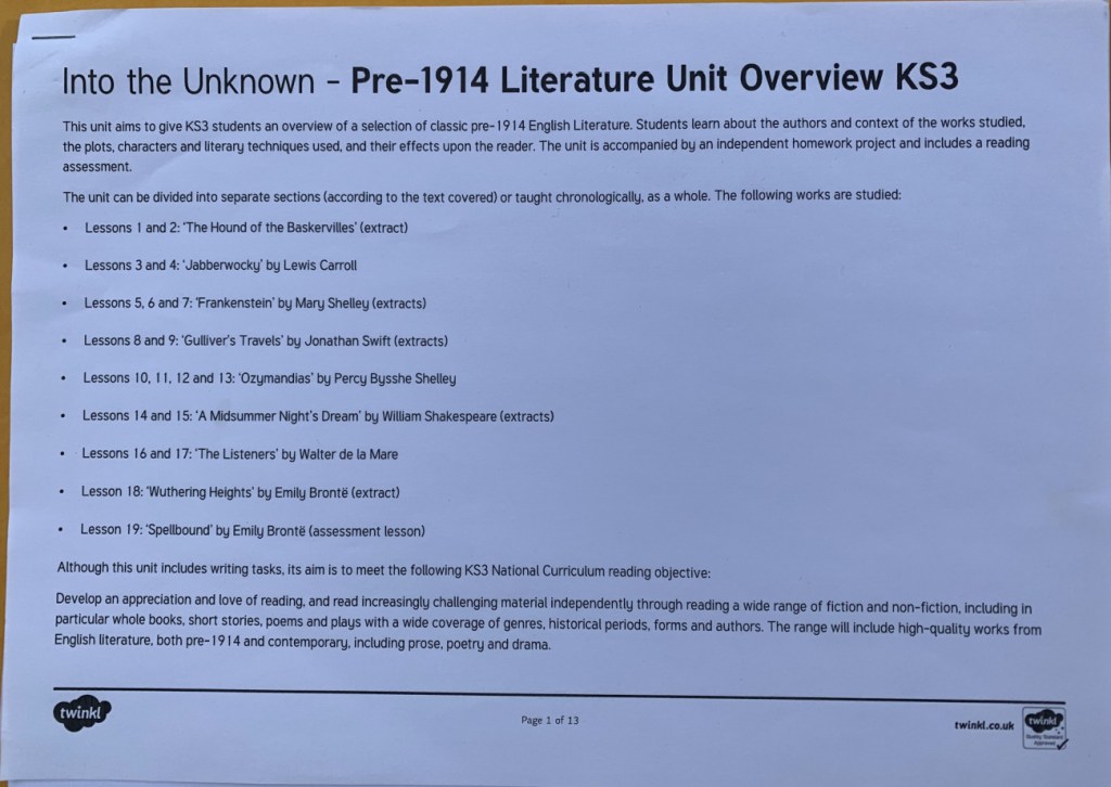 I mentioned at the beginning of my daughter’s Year 9 that we have chosen a few KS3 English units off the Twinkl website which we were planning on working through. We have just completed their English Literary Heritage unit which I must admit was a bit longer than the other English units that we have worked through but it was really interesting and I felt like it laid down some good groundwork for next year. So I thought it would be a good unit to write a post on.