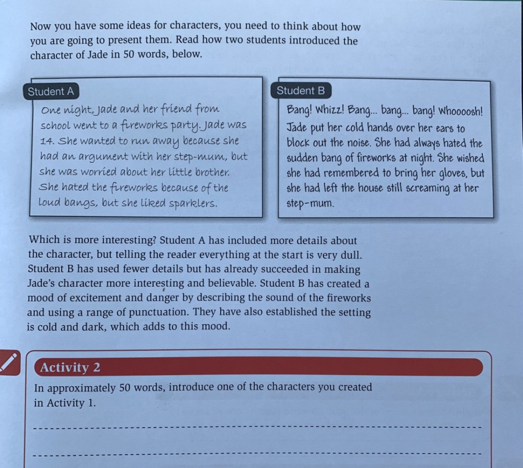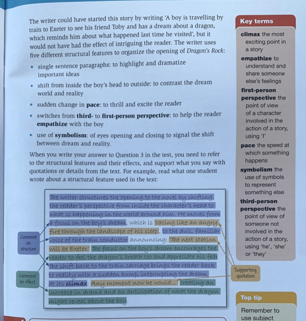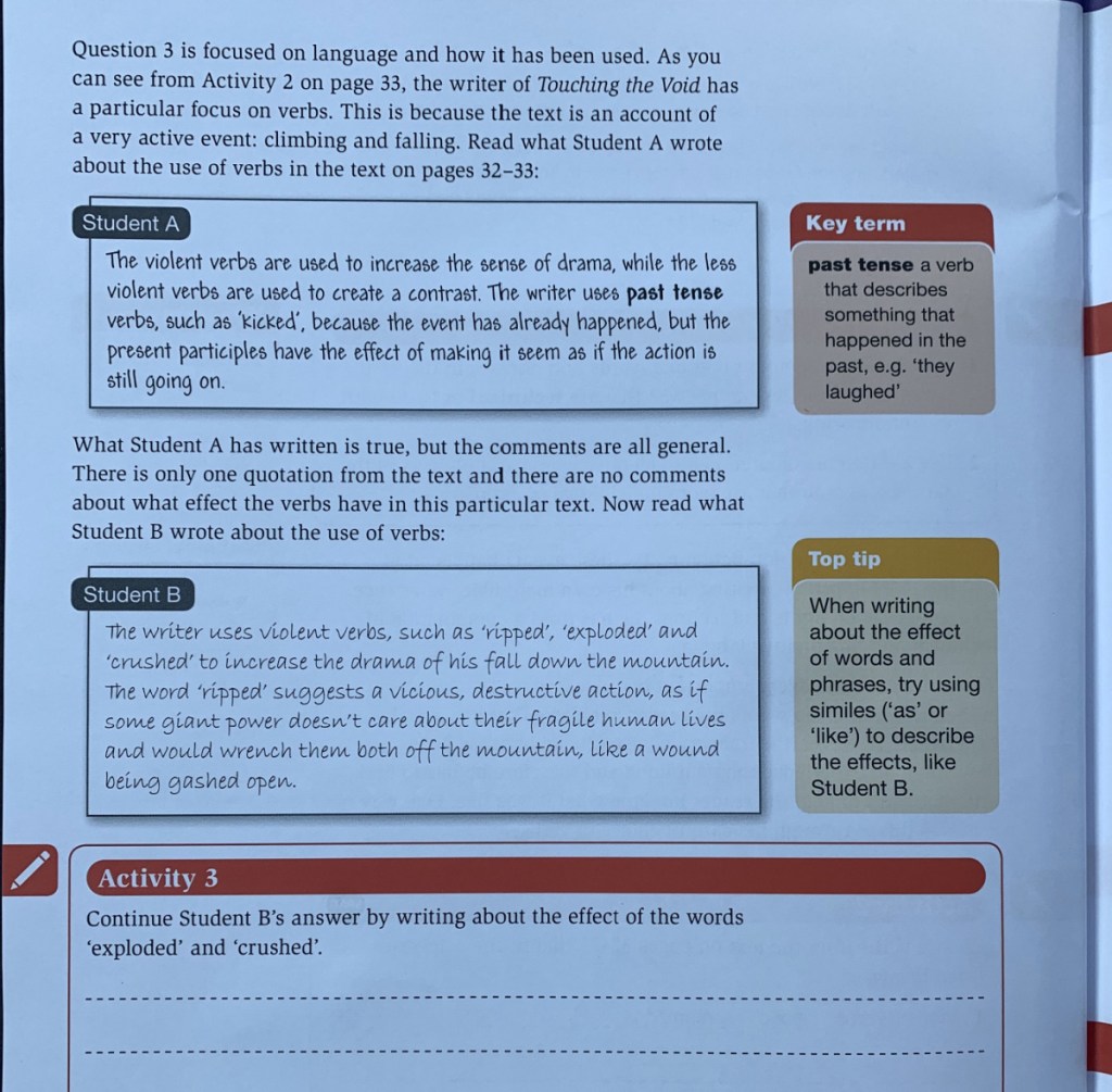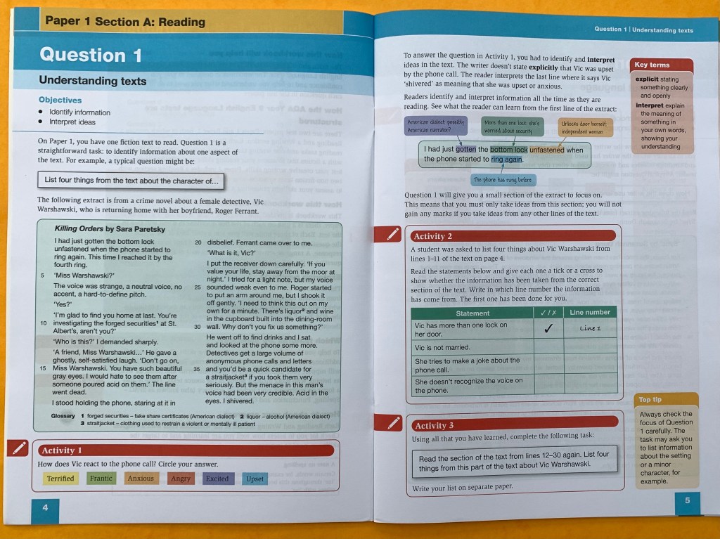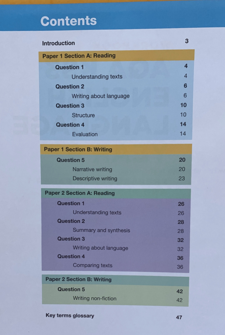 The workbook itself covers both Paper 1 and Paper 2 and it works through each question in each paper. And they work through questions on writing about language and structure (which were two things we were specifically looking for) and I must also point out that I really liked the points and tips under the Writing Questions. You might look at it and think 47 pages that is not long but they have included a lot of important points in those 47 pages.