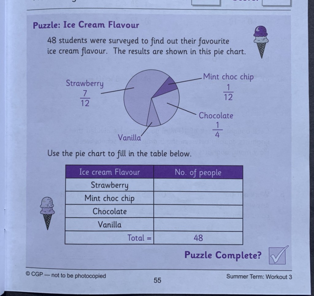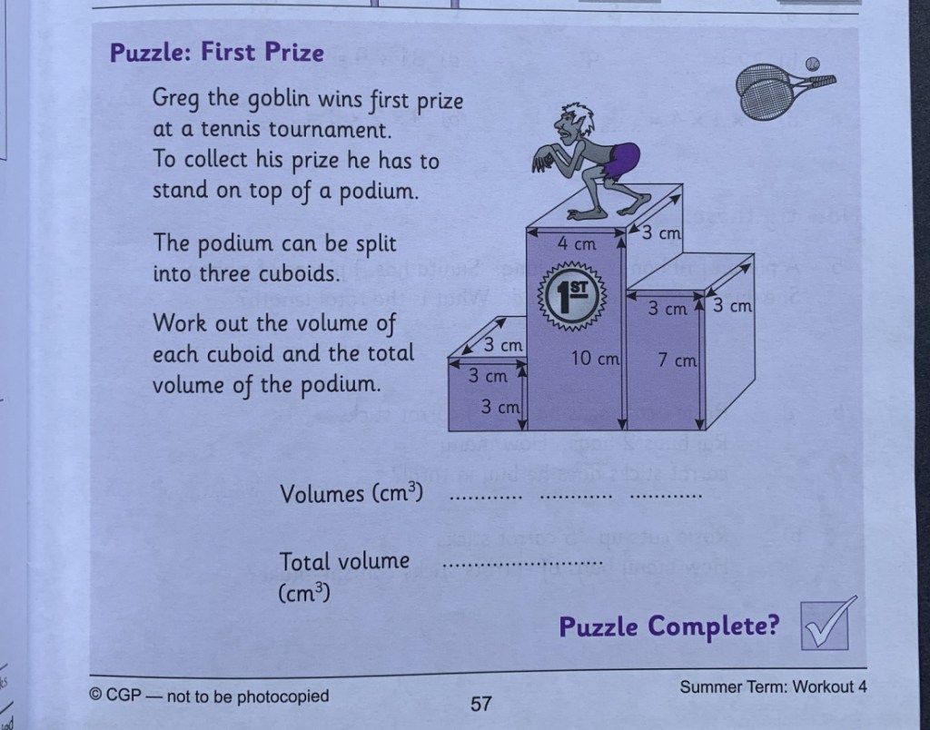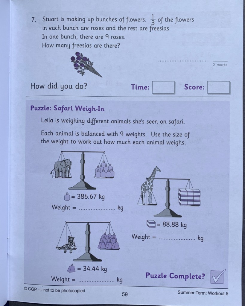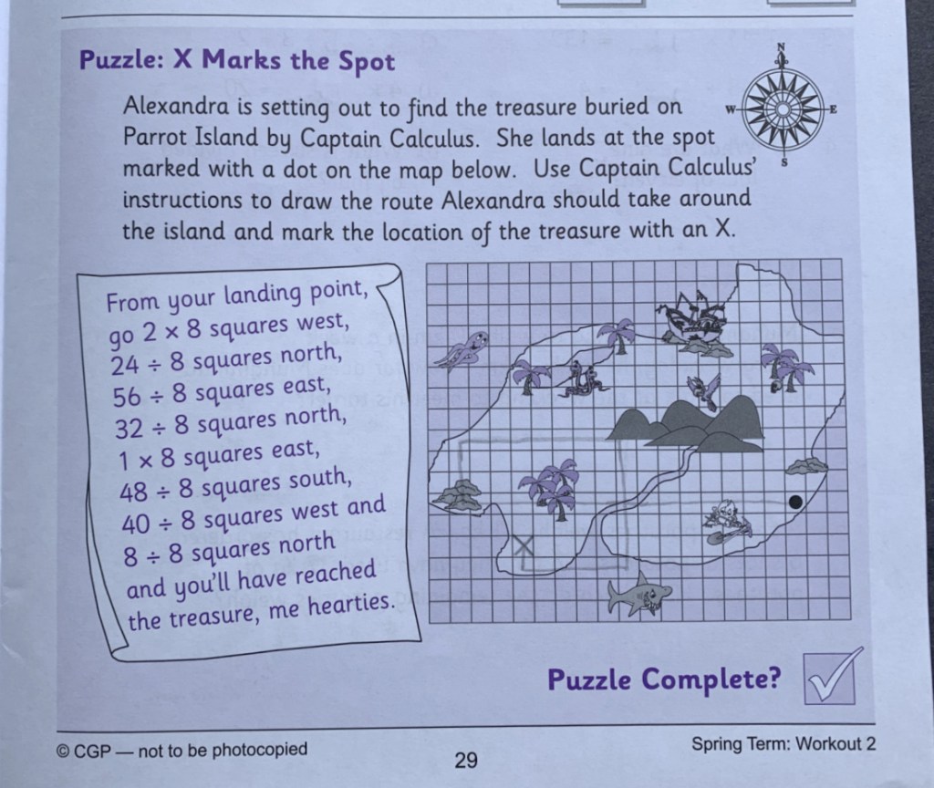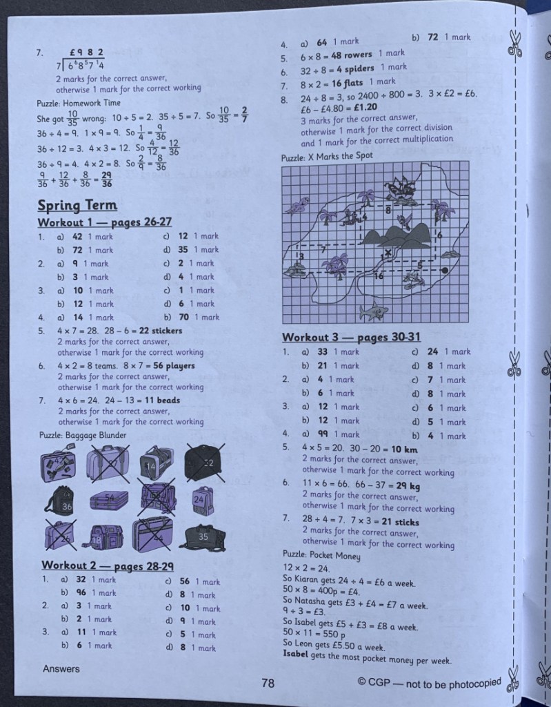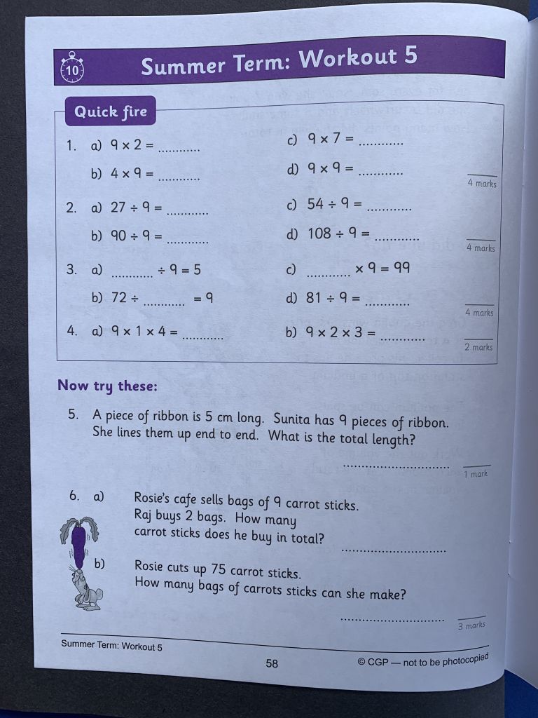 Each Workout is broken down into three sections. Section 1 is the Quick Fire section which is just basic times table, division sums that the kids need to answer. Section two tends to 3 or 4 story sum type questions and then Section three is the Puzzle – which is slightly harder but it is a great thinking activity where the kids see how knowing the times tables help with other Maths. I have also noticed that the questions do get harder as the book progresses.