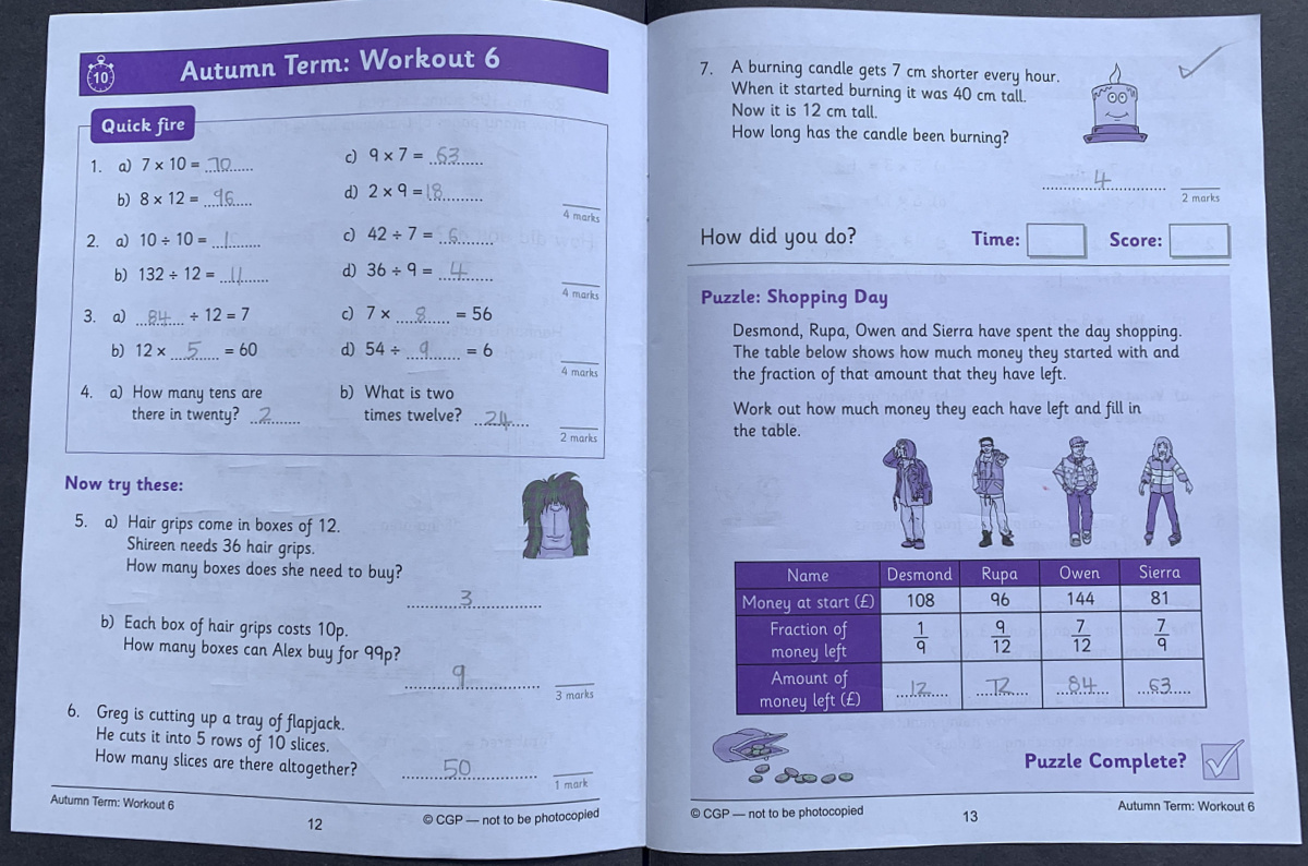 Each Workout is broken down into three sections. Section 1 is the Quick Fire section which is just basic times table, division sums that the kids need to answer. Section two tends to 3 or 4 story sum type questions and then Section three is the Puzzle – which is slightly harder but it is a great thinking activity where the kids see how knowing the times tables help with other Maths. I have also noticed that the questions do get harder as the book progresses.