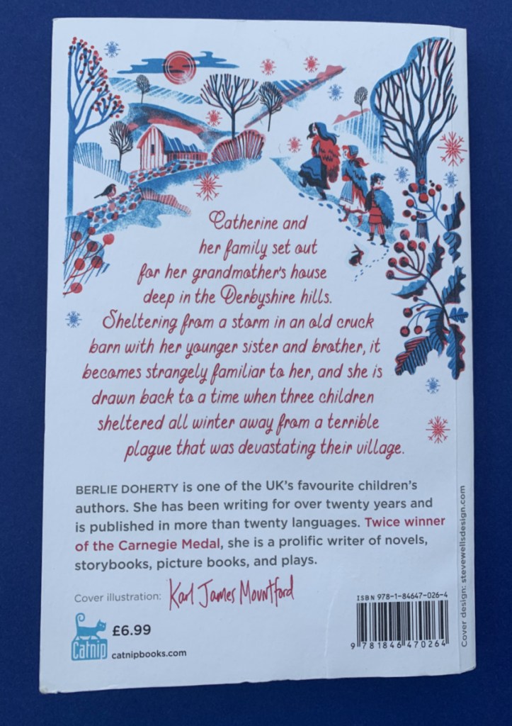 The story starts in Yorkshire in modern day life and it starts with a family out on a hike. The weather turns and the three kids end up taking shelter in a barn, separated from their parents. While they are in the barn the oldest child Catherine starts feeling strange, like she has been there before and suggests to her siblings that they play a game pretending that they are living in the past. As the game starts so the reader is transported back into time to 1660 where three siblings are being taken up to the same barn to isolated from the village, where people are dying from the plague (their parents do not stay with them in the barn as they are concerned they may have the plague). The author helps to distinguish between the different time periods by the way in which the children speak when they are in 1660 there is a lot of “tis and thy” which is very effective.