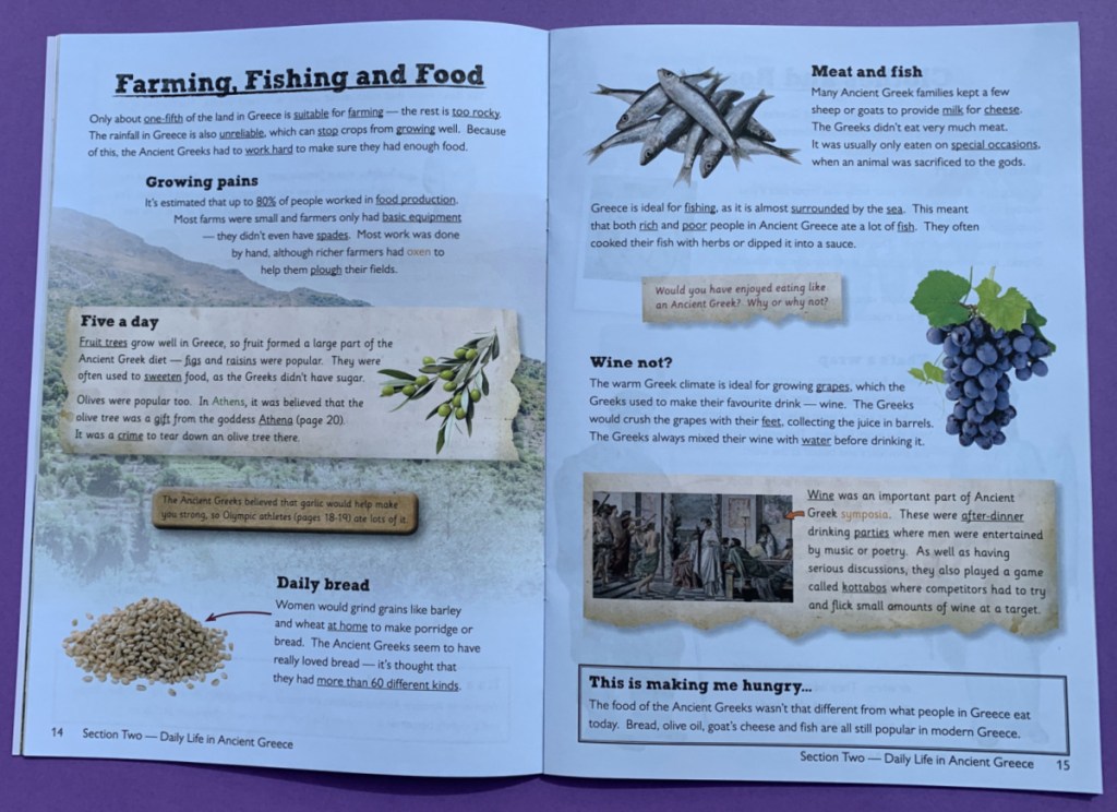 The Study book gives the kids a complete overview of the Ancient Greece topic, but there may be instances where you want to take it further – I like to think of it as a solid foundation and we then go and investigate certain things in more detail. The Activity book really is linked to the Study book and you can’t really use it (the activity book) unless you have the study book to refer to. The basic set up is a double page in the Study book equates a double page in the Activity book. They cover the exact same material, follow the order and really do work hand in hand together. (In the pictures below the colour pages are from the study book and the black and white pages are from the activity book)