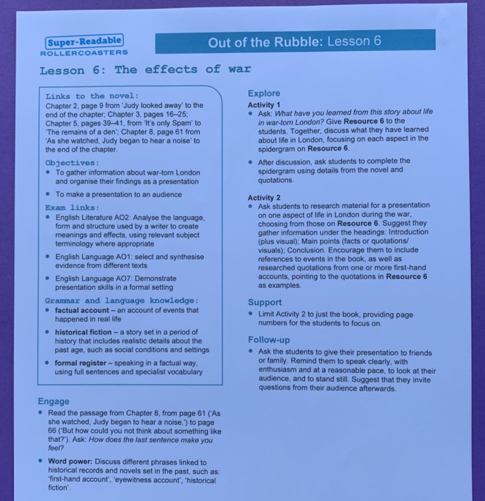 Out of the Rubble is part of a series of books called Super-Readable Rollercoasters aimed at encouraging struggling KS3 readers to get to grips with a good book. We have now read three books in this series (Lightning Strike, and Edgar and Adolf) and they have all been written in a easy to read yet engaging manner. My daughter, who is an avid reader really enjoyed this book, she loved the story and was captivated by the thought of what it must have been like to try and put your life back together after World War Two. For her it was a quick read but an enjoyable, thought provoking read. I also read it and I do think the writer has written it in a manner which would engage struggling readers.