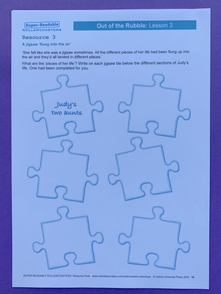 One of the reasons I like these Rollercoaster Resources is the activities which they include are always varied. We have worked through quite a few of these Rollercoaster packs and the activities included are always different and always relevant to the story (I never feel like they have just slotted a worksheet in to tick some box, it always links into the story). For example in this pack the activities included were writing a play script, using metaphors and powerful adjectives in a poem, nightmare settings, timelines and different types of homes and a lovely jigsaw activity. All of the activities really did suit the story, the themes in the story and just seemed liked a natural progression of what the kids were reading.