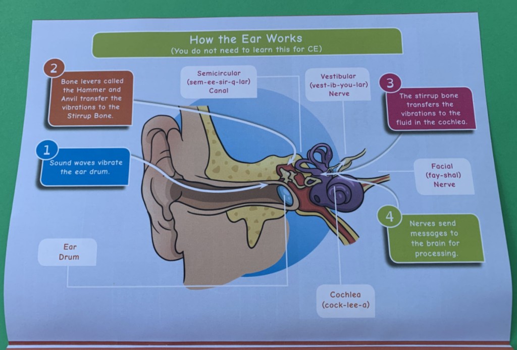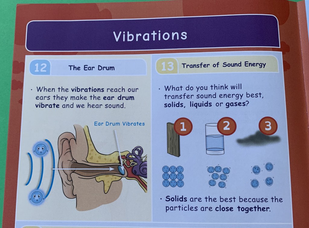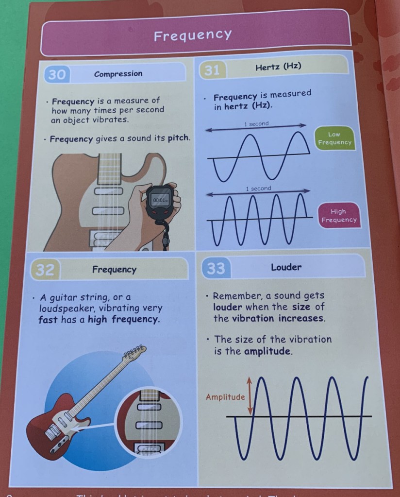 It covers how the ear works (we really loved this diagram), sound energy, the decibel scale, vibrations, the speed of sound, particles in air, sound waves, frequency, changing pitch and echoes. Really a lot more than I was expecting but I loved that it covered all of this.
