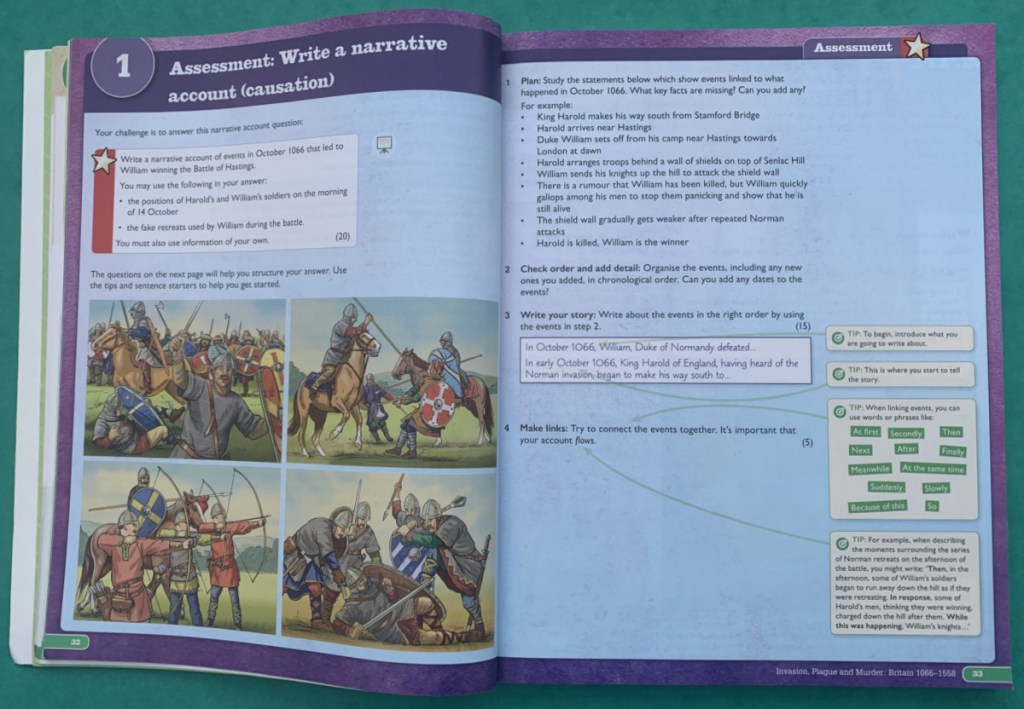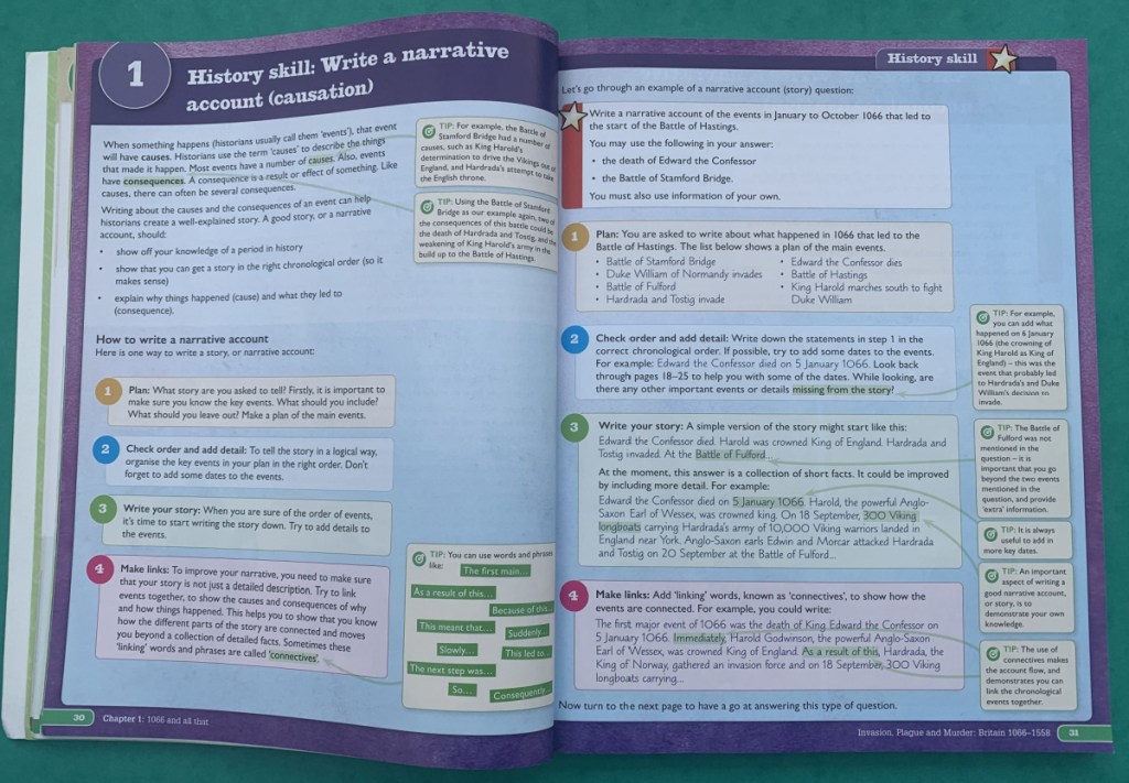 And finally you get the History Skill Questions. These are the ones that are worth their weight in gold. These questions are honestly just by themselves enough of a reason to get this book. They are longer writing questions which help to build up the skills required to answer the history questions that you would get later on (GCSE or IGCSE). And they have included step by step guidance on how to structure your answers. When I say these questions are gold I really do mean that because with hindsight after working through all three books with my oldest and now being about to start her IGCSE History course with her I actually feel like we already have a good foundation in place on how to tackle these longer worded questions and I don’t feel that they are as intimidating. I really can not stress it enough how these longer questions and the step by step guidance on answering them are just some of the best stepping stones you will find in terms of helping your kids structure longer answers.