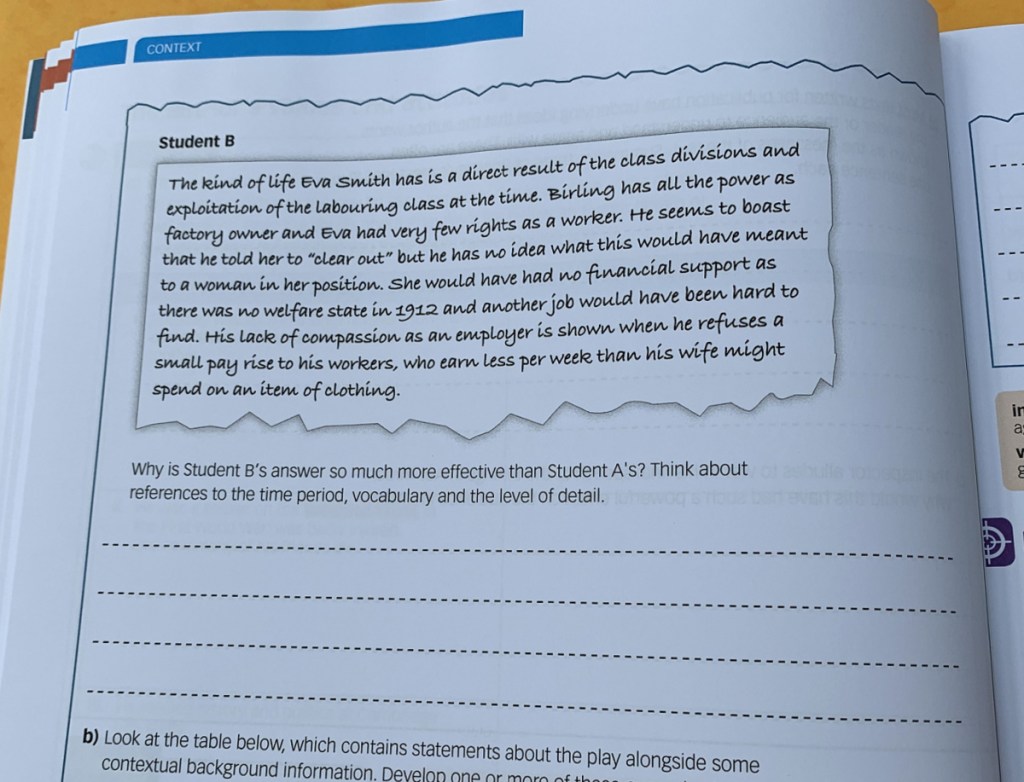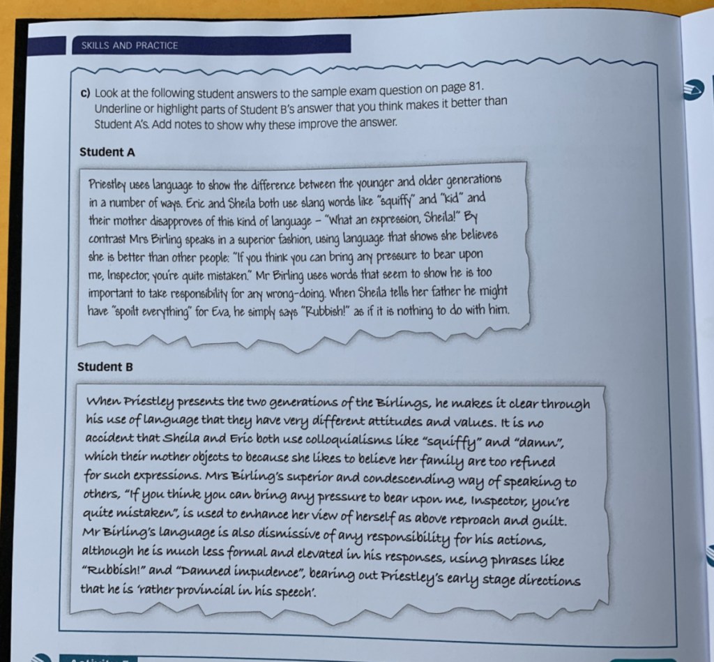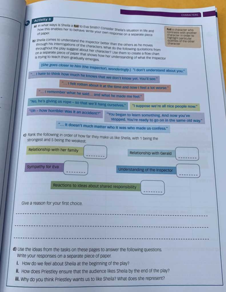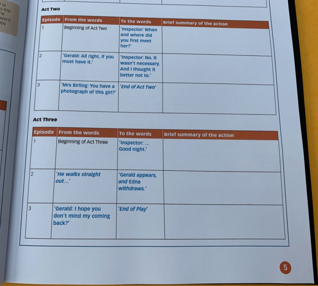 Plot, Context, Characters and Themes – these are all the areas that I was expecting. I feel like I have a fairly good grasp on them (I have already done a lot of research and prep work for An Inspector Calls) but even so I like the activities, the way they have broken these down and then built them up. I like the fact that as we start discussing these topics I can open up this workbook and get my daughter to work through an activity. And yes even though my daughter and I do a lot of her literature verbally (ie we discuss it together) I still like her to sit down and write out her thoughts. I found with the Macbeth workbook that just sitting down and putting pen to paper really solidified her thoughts and her understanding.