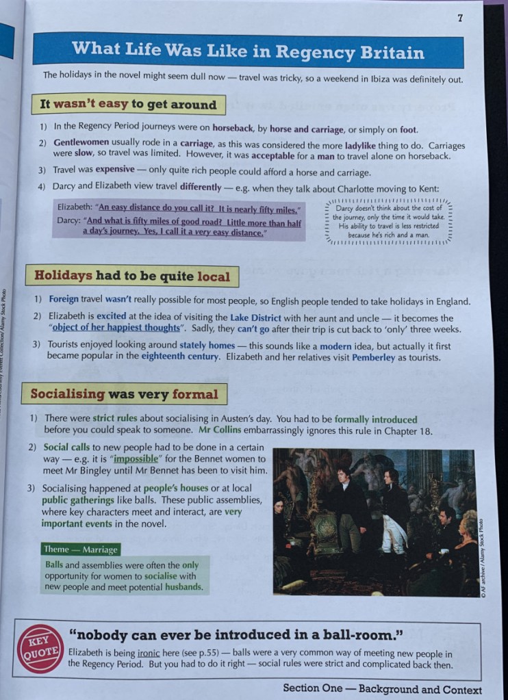 Characters. My daughter loved the characters that Austen created in this book. They have such depth to them and she loved how they interacted and how learning about one character always meant you gained insight into some of the events. We enjoyed these 12 pages and appreciate the fact that the text guide went into more detail for Elizabeth and Darcy. We found the highlighted blocks in this section insightful and are sure that lots of kids will find them really useful. Again I must stress that we liked the way the quotations were handled, we felt they picked out the essential quotes and made sure they were clearly explained. And again two pages of practice questions broken down into the quick questions, in-depth questions, target Grade 8-9 and the exam-style questions.