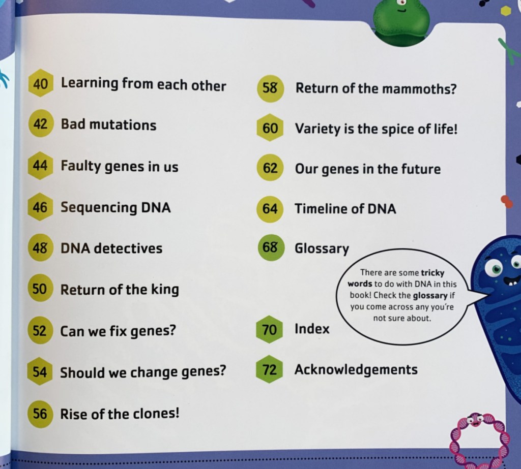 I think that is a lot. It really does explain what DNA is, how it is structured, what it can do and then all the things that DNA is a part of (like mutations) and I have to admit I really liked the last little bit called the history of DNA.