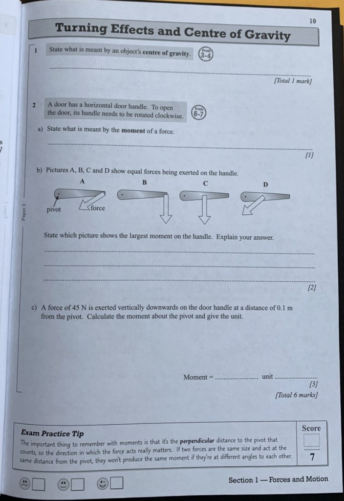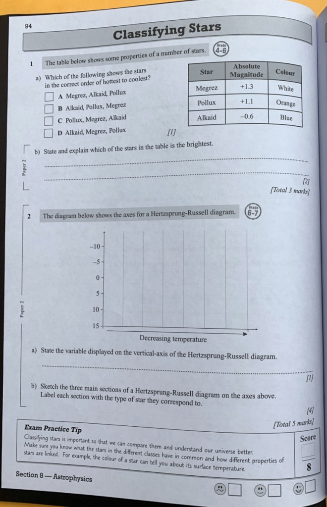 Under each section they include a nice range of questions, it is a combination of multiple choice, graphs, explanation, practical, really a good mix. They also indicate which are the harder questions (ie it will say grade 7-9 above the questions). I have been happy with the mix of questions in these books. And at the back of the book they include two practice papers (I am constantly looking for practice papers so I love that they have included 2 examples in this book).