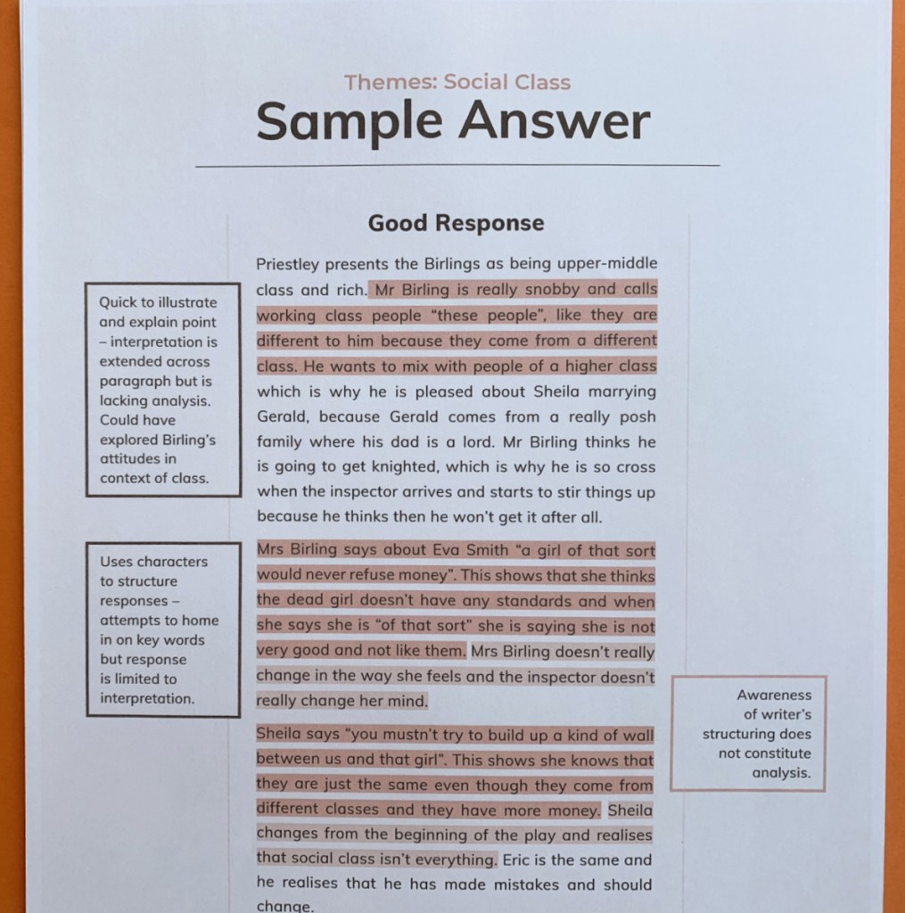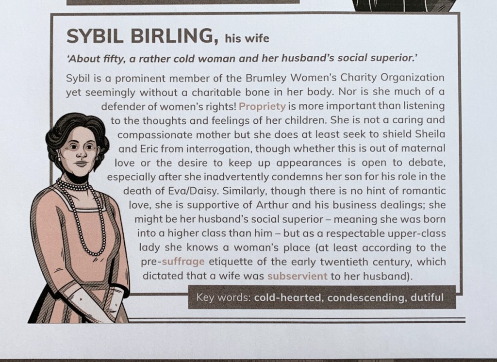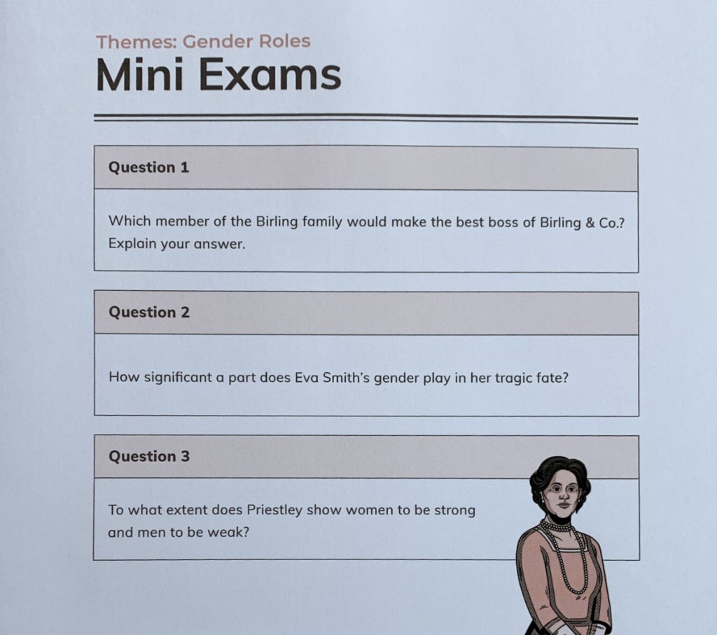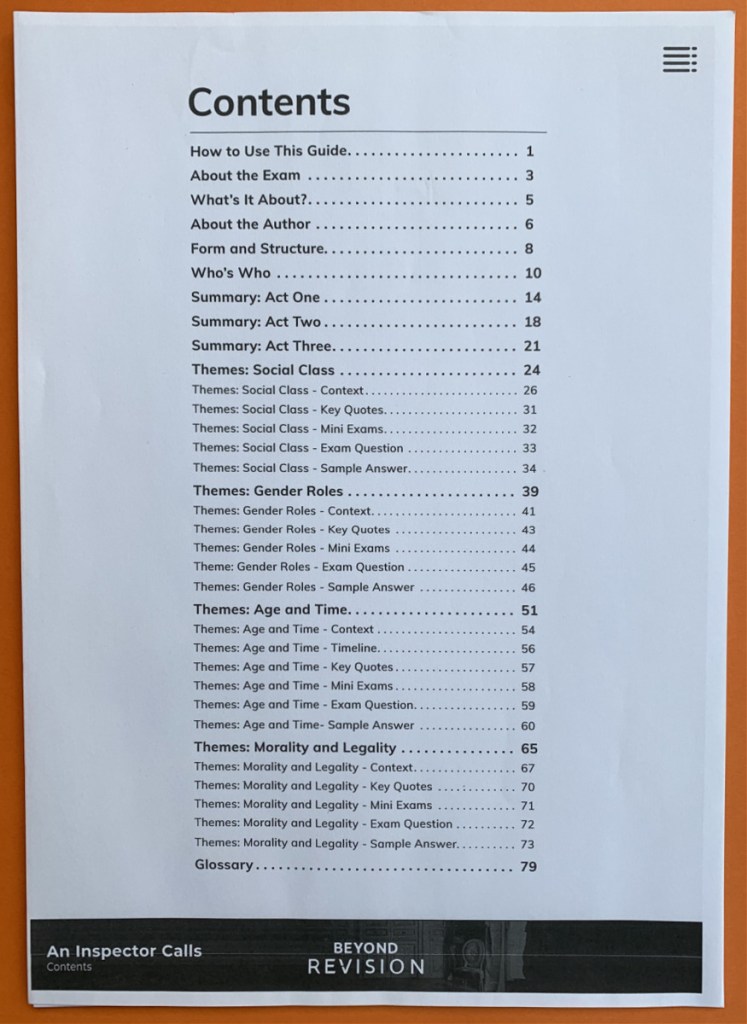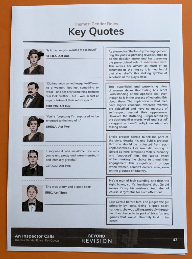 Okay so these pages are really wrap it all up very nicely. But then we go into a bit more detail and cover Four Themes of the play – Social Class, Gender Roles, Age and Time and Morality and Legality. Each theme is broken down into – Context (background info – vital), Key Quotes (really useful), Mini Exam questions, Exam Questions and the Sample Answers (the sample answers are a must read, really do yourself a favour and if you read nothing else read these and look at the comments about the sample answers).