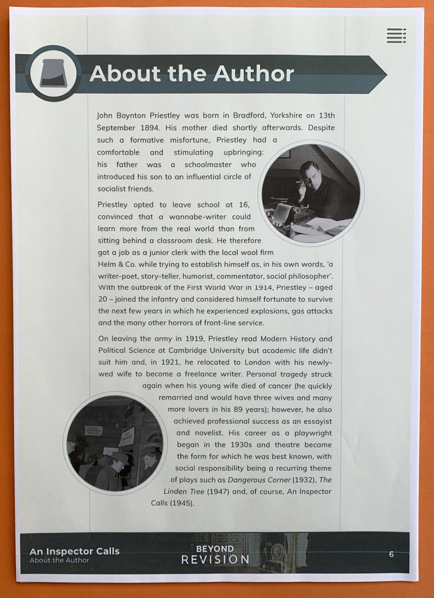 Okay so this really is a revision guide that includes everything. It starts off with a bit about the exam which I am not going to go into then it is about the author – know this is actually quite important, by understanding a bit about the author, and his background you get to understand some of the themes of the play. We have already spent quite a bit of time just talking about the play writer, his concerns and the historical context of this play as it really is vital to understanding what the play is about. So I was really glad that this was included and included right at the beginning because it is actually your starting point.