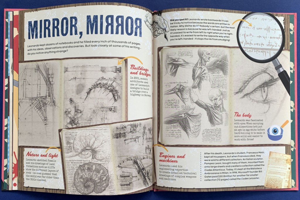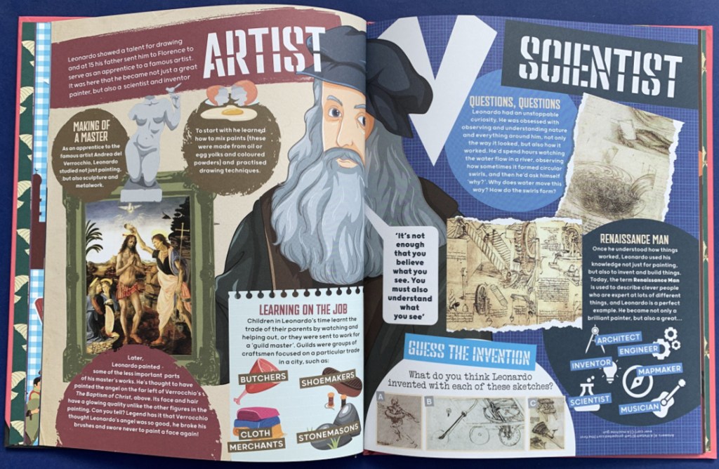 Content wise I was impressed. I thought they included lots of interesting facts, some of which I expected but quite a bit of it was new to me. And I loved the fact that although they do talk about his art (of course how could you write a book about Leonardo Da Vinci without mentioning the Mona Lisa or the Last Supper) they also talk a lot about his other interests and his personality. I found learning that he had a habit of not finishing his projects and that he was a vegetarian (because of his love of animals) fascinating.