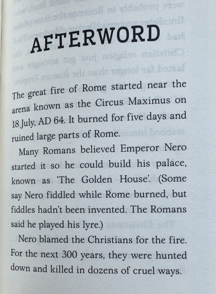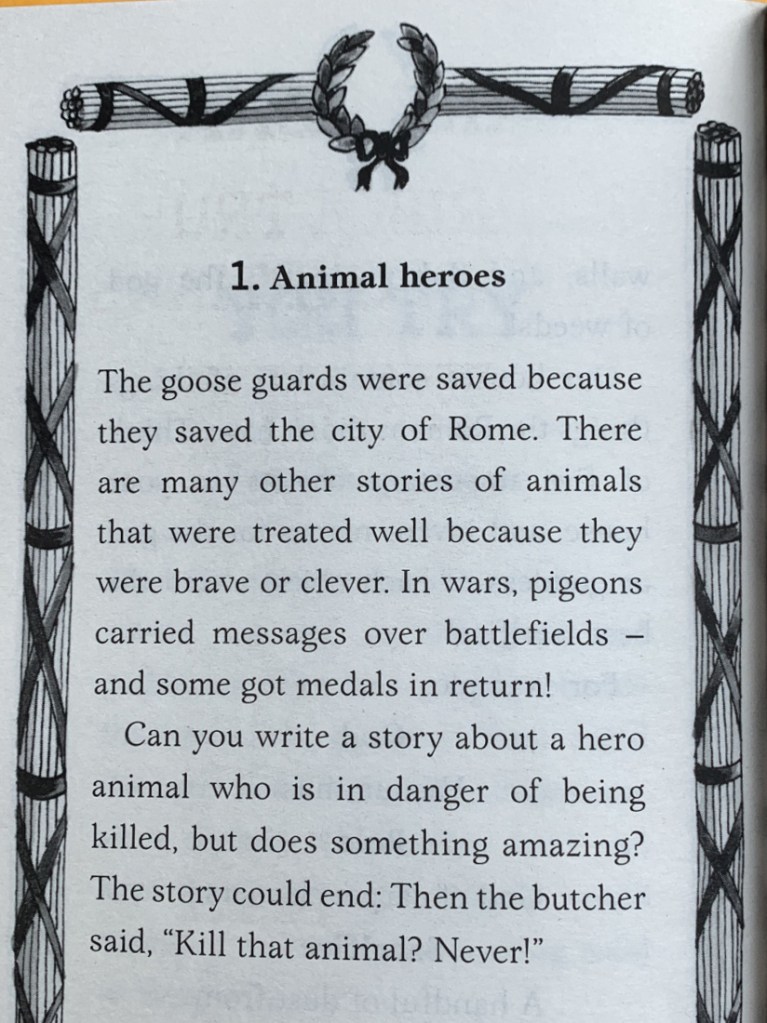 The Roman stories are – 1. The Captive Celt. A young British boy is taken back to Rome as a slave after his tribe is killed and he now has to adjust to life. He happens to meet a British Chief who is also captured and who manages to convince the Roman senate to spare his life. I found this very interesting as I was fascinated by the fact that it was based on an actual British chief Caratacus who really did persuade the Romans to spare his life. 2. The fatal Fire. A young servant girl witnesses how a fatal fire in Rome starts and who actually started it. This was a fascinating read and did get me thinking about what people in power could/would do and what it would have been like being that servant with no power. 3. The Grim Ghost. A young boy is helping prepare the food for a feast when the master of the house (Pliny) ends up telling him a ghost story. I enjoyed this one because Pliny was a famous for the letters that he wrote including one about the the day that Mount Vesuvius exploded. And apparently Pliny was also famous for the feasts that he held and the ghost stories that he told. 4. The Goose Guards a story about the Gauls attacking, Romans trying to survive and some geese. It might sound strange but apparently the geese guards were a well known Roman legend.