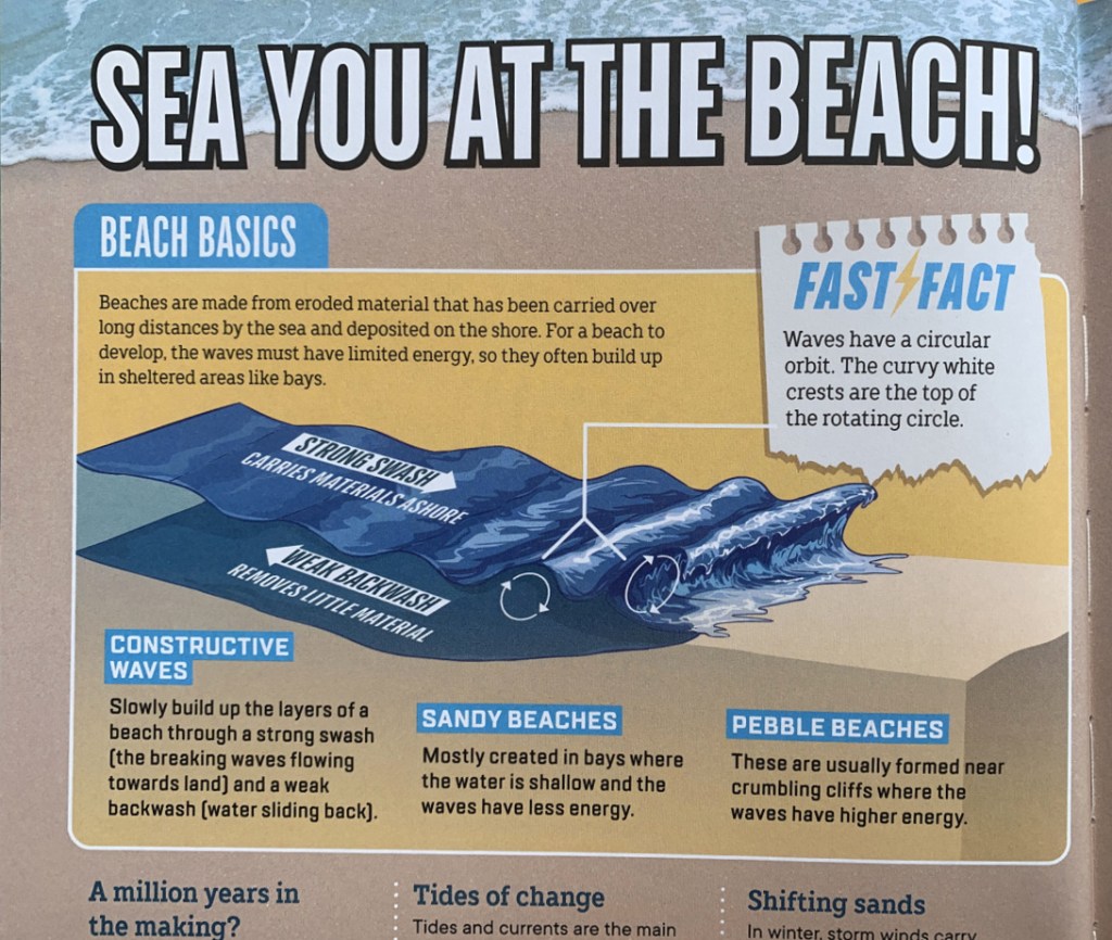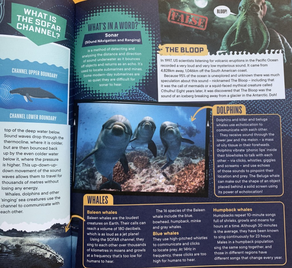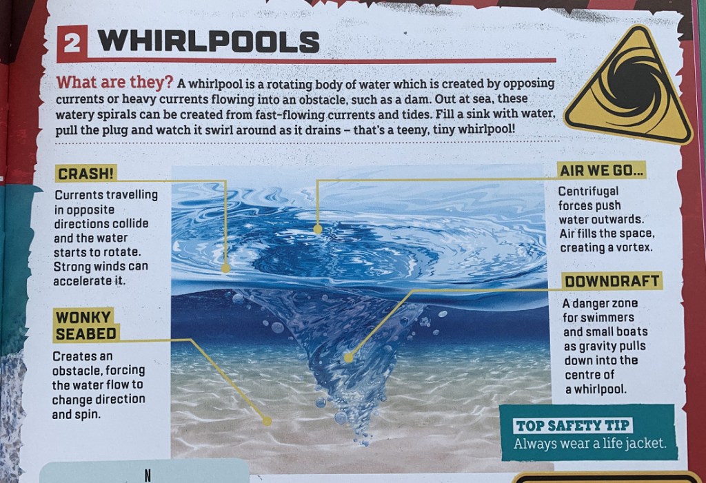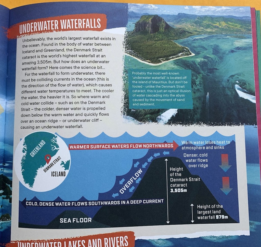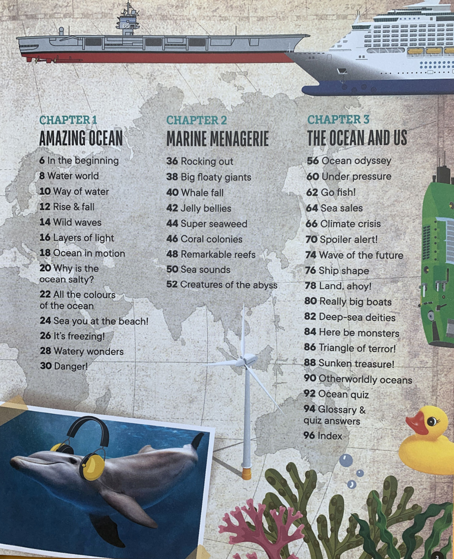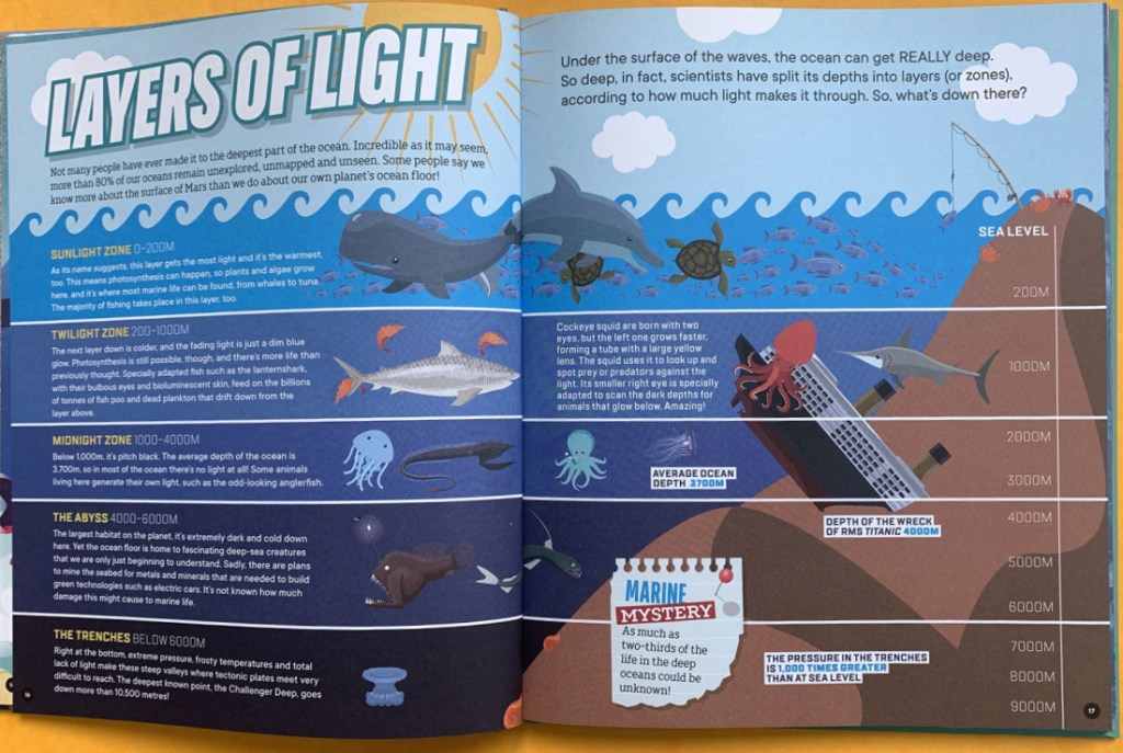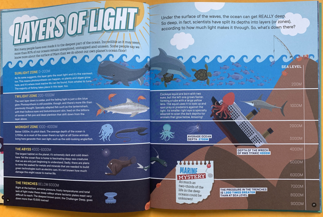 All the typical things that you would expect – like marine animals, waves, layers of light etc but it also included a lot of things that I did not expect – like why there is water on earth (according to the big bang theory), whirlpools, underwater volcanoes, detail about seaweed and different coloured beaches and then the entire third chapter. They really have fitted a LOT in. I was really impressed with how much they have included and the variety of interesting information that they have included.