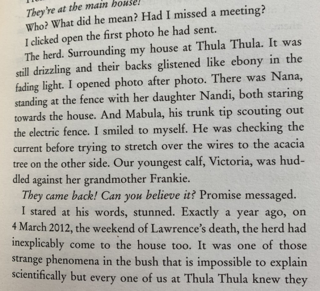 Okay so the book itself is written in a slightly different style because it is Francoise telling her stories, so it does read a bit differently but the stories are as heart warming and sometimes sad as they were in the Elephant Whisperer. In the beginning of the book she does deal quite a bit with trying to cope with running Thula Thula by herself (which is quite something considering she grew up in Paris). I enjoyed the entire book. I loved that the herd kept being their amazing self, that she mentions them coming to mourn Lawrence, that they still came to visit her and seemed to give her strength when she needed it. These elephants are just incredible.