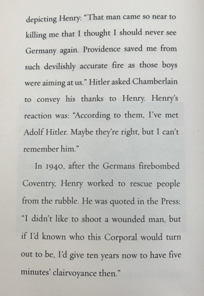 It is a beautiful tale which deals with many aspects of the First World War including how it must have felt to try and put your life back together after the war. However the key point comes when Billy discovers that a German soldier who he chose not to shoot turned out to be Hitler. Naturally Billy starts going through a lot of emotions including regret and guilt.